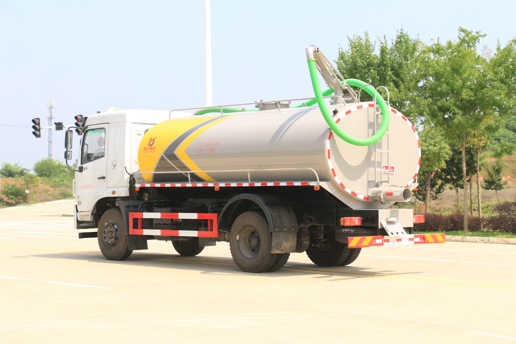 罐体两侧中部设有走台箱,平时用于搁置吸粪胶管,维修时站立。前封头设有观察量管,便于监视装载量,防止超载。底部设有清洗孔,平时密封着,清洗罐体时,可打开清洗孔盖,让污水自流排出。
